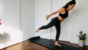 Challenge your strength and balance in this sequence that will have your muscles shaking and your heart pumping. Modifications and variations are given throughout so you can determine what is best for your body. 1lb-5lb weights are recommended. 26min